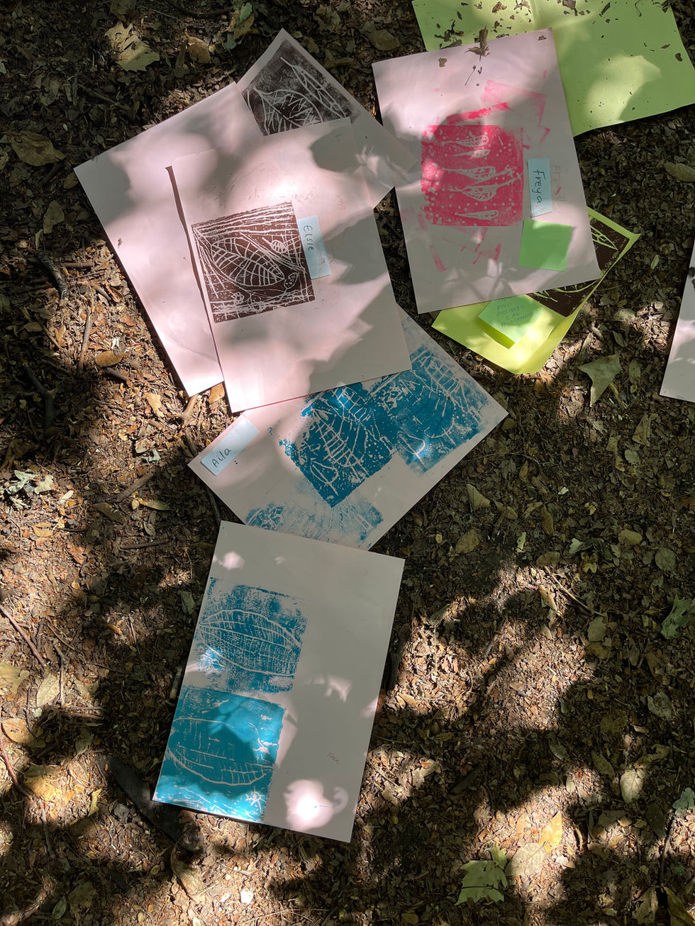 ”I can hear cruncheey leevs” installation was a collaboration with architectural designer Zoe Grainge. I led workshops with local primary schools, exploring the senses and play in nature through foraging, printmaking, drawing and creative writing which informed the artwork and design. The wooden shapes that surround the installation are direct cuts from the children’s drawings, and offered unstructured play opportunities. The installation was commissioned by Dulwich Picture Gallery for their Sculpture gardens and was open to play and crawl in from July-September 2025.